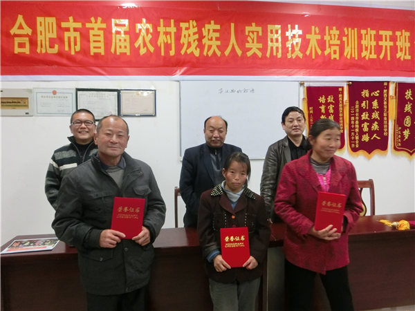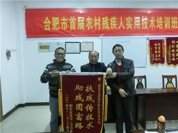 2014年11月26日,肥东县元疃镇农村残疾人在肥西天都园艺职业学校参加食用菌栽培技术培训圆满结束。肥东县残联对学校培训给予了高度赞扬,并赠送学校“扶残传技术,助残圆富路”锦旗。学校还在参加此次培训班的学员中选拔了三名表现突出,成绩优异的“优秀学员”,并颁发荣誉证书。此次培训效果显著,很多残疾人表示食用菌栽培技术并不难,尤其是利用长稻麦草露天大田、林下栽培幸福菇技术更简单,成本低、效益高,特别适合残疾人在家发展,愿意与公司合作。