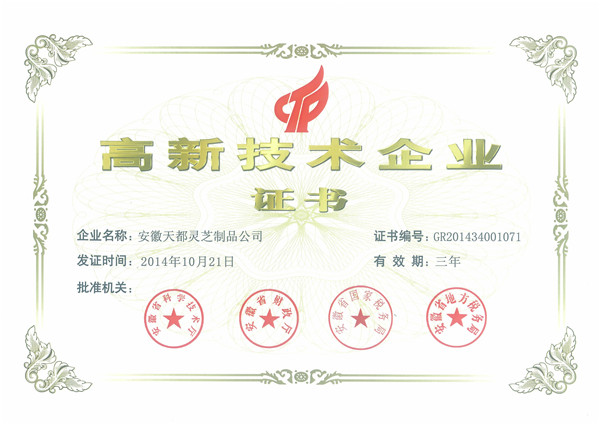 2015年1月21日安徽天都灵芝制品公司被安徽省科技厅、安徽省财政厅、安徽省国家税务局、安徽省地方税务局认定为高新技术企业。自2014年1月1日起享受国家高新技术企业所得税等优惠政策,在食用菌企业中是第一家获得国家高新技术企业。安徽天都灵芝制品公司现有强大的科研团队,2014年公司申报50多项专利,制定了茶树菇、猴头菇、秀珍菇生产技术规程,建立了珍稀食用菌研究工程技术中心,成立了培训学校,带动了3600户农民发展食用菌生产而脱贫致富。天都牌食用菌产品被中国绿色中心认定为绿色食品A级,是安徽名牌产品。特别是本公司研究的利用稻麦草露天大田、林下栽培幸福菇的新技术得到政府的大力支持,为秸秆利用找到新生路,是农民增收新途径,技术辐射到全国27个省市。