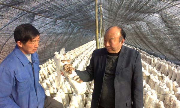 丁伦保总经理(右一)正在给种植户指导香菇栽培技术