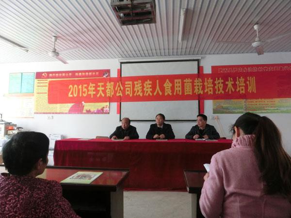 2015年3月25日,安徽天都灵芝制品公司在肥西县严店乡油坊村举办残疾人食用菌栽培技术培训,来参加培训的残疾人有25人。食用菌专家丁伦保给残疾人上课,为了鼓励残疾人自强自立,自主创业,天都公司对残疾人种植食用菌,不仅免费技术培训,还无偿提供菌种支持,实行产品回收。2015年天都公司计划在全县重点扶持100户残疾人栽培食用菌,通过3年扶持,使残疾人脱贫致富,凡来参加培训的残疾人给予误工补助60元。