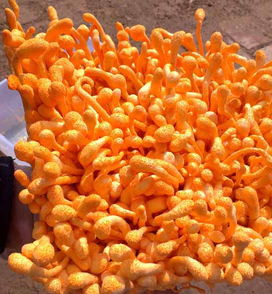 “天都”牌蛹虫草,以蚕蛹为原基培养而成。其成份与冬虫夏草相似。可以作为菜品或滋补品食用